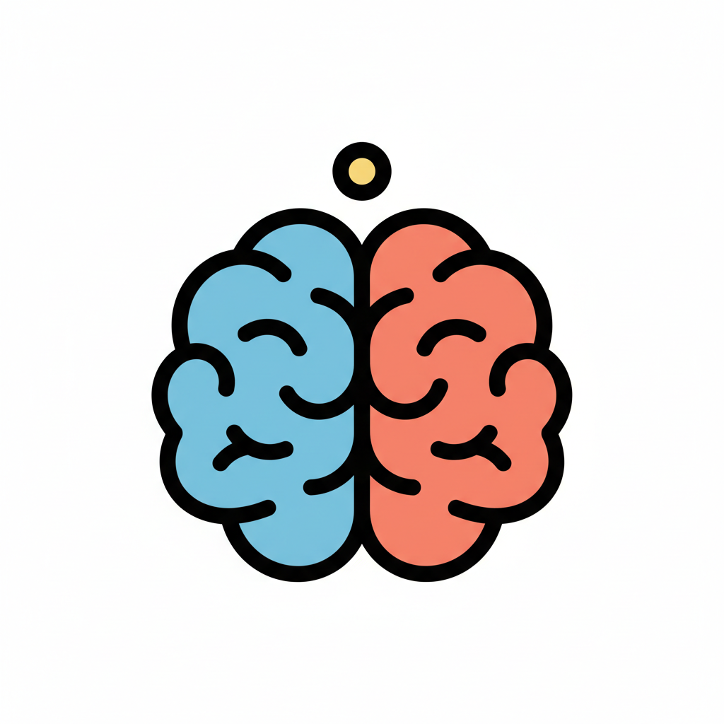 Farbiges Gehirn-Icon, geteilt in blaue und rote Hälften, mit einem Punkt darüber.
