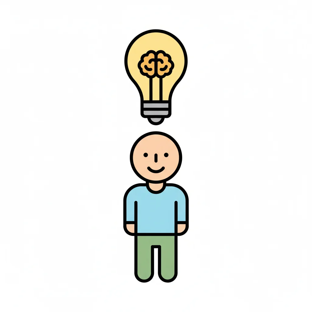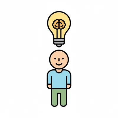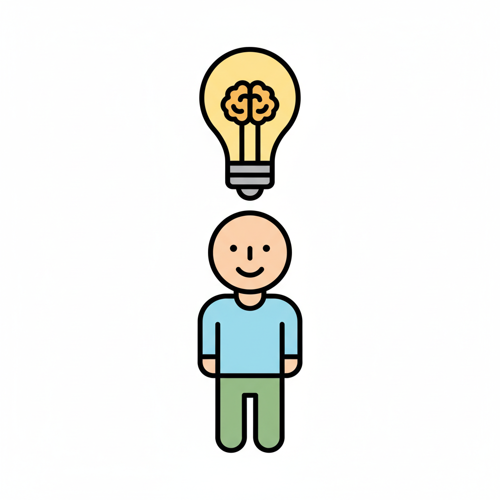 Stilisierte Person mit einer Glühbirne und Gehirn darüber, symbolisiert eine Idee oder Intelligenz.