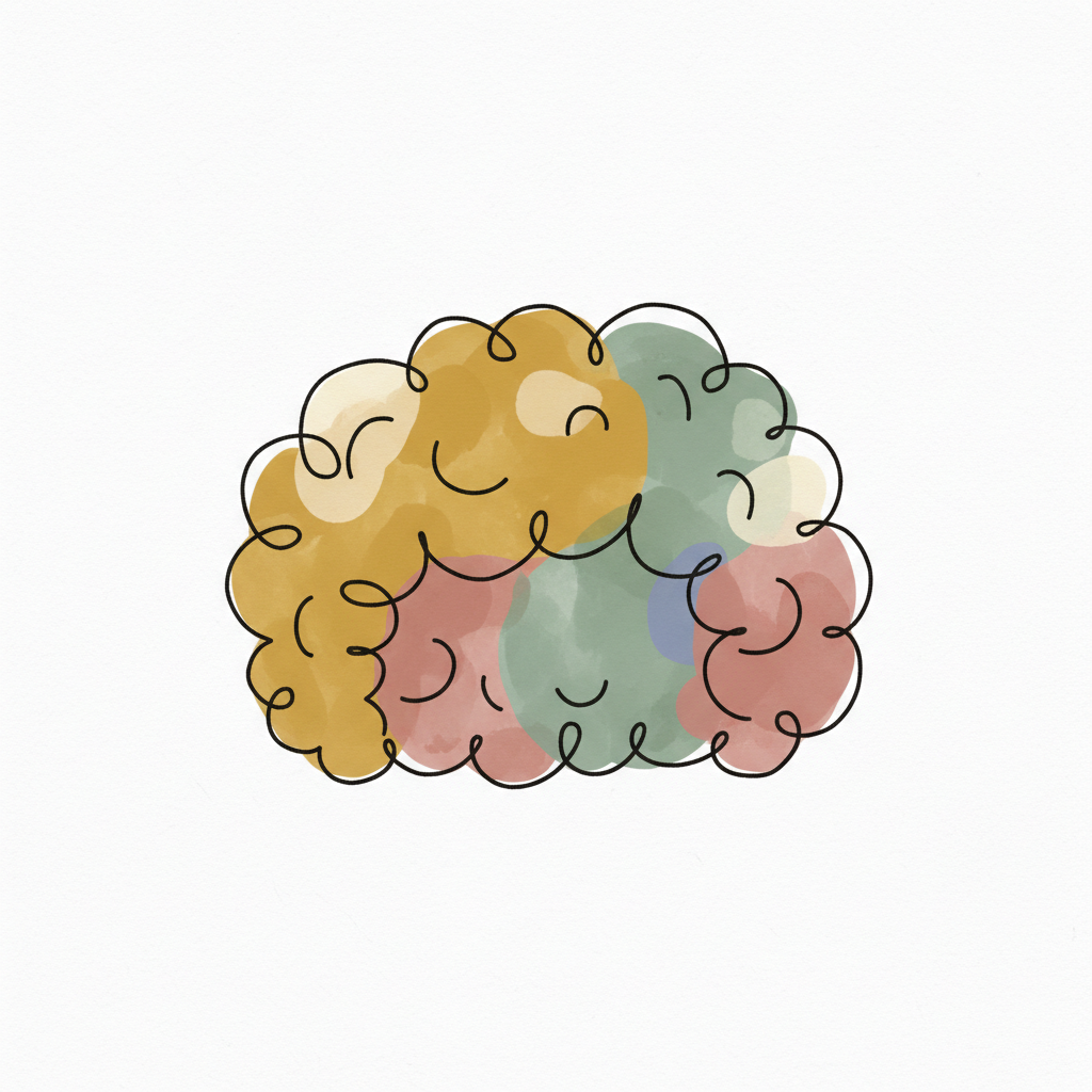 Abstrakte Gehirn-Illustration mit bunten Aquarellflecken und durchgehender schwarzer Linie.
