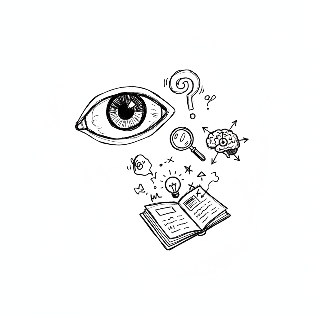 Schwarz-weiße Skizze von Auge, Buch, Gehirn, Glühbirne, Lupe und Fragezeichen, symbolisiert Lernen.
