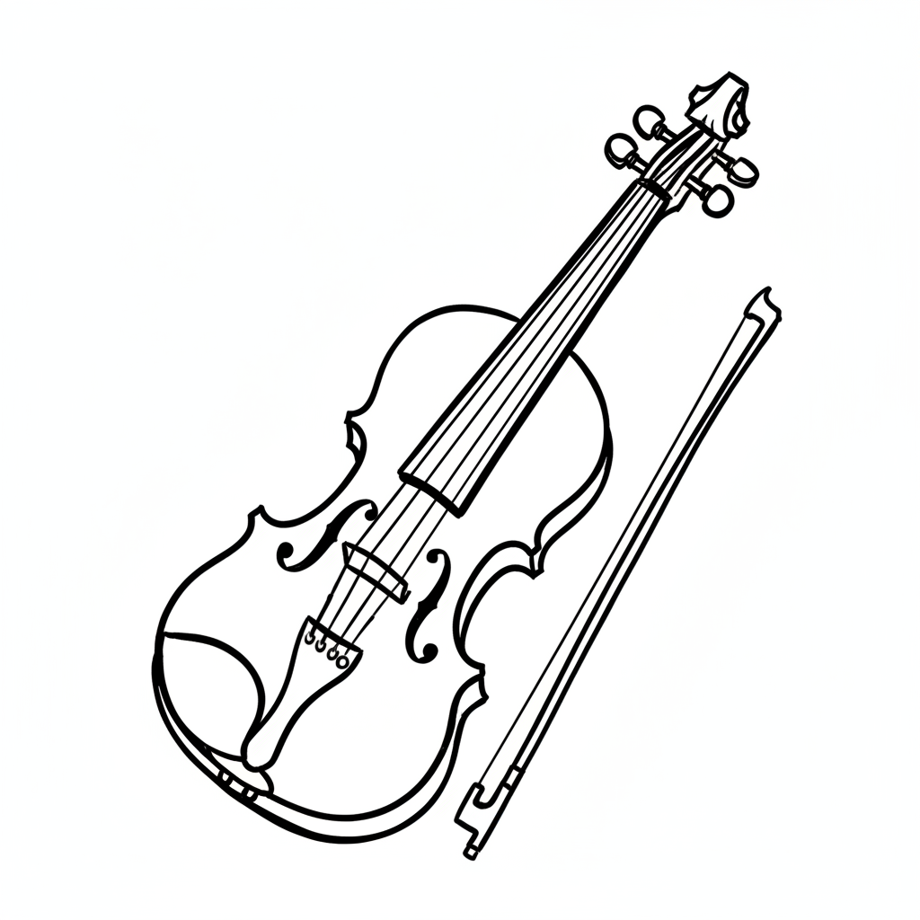 Schwarz-weiße Strichzeichnung einer Geige mit Bogen auf weißem Hintergrund.