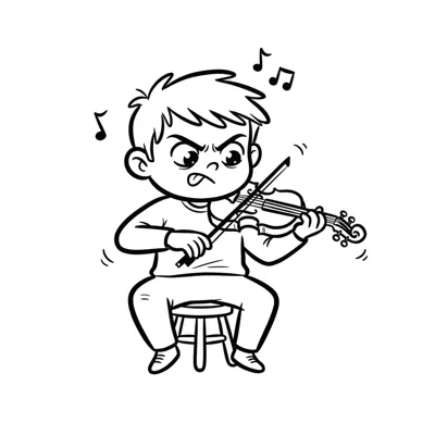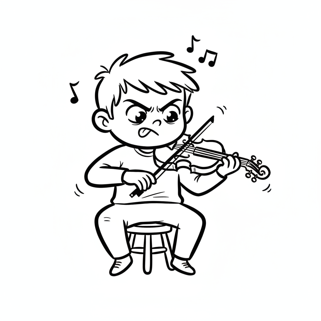 Wütender Cartoon-Junge spielt Geige mit Noten, die um ihn herumfliegen.
