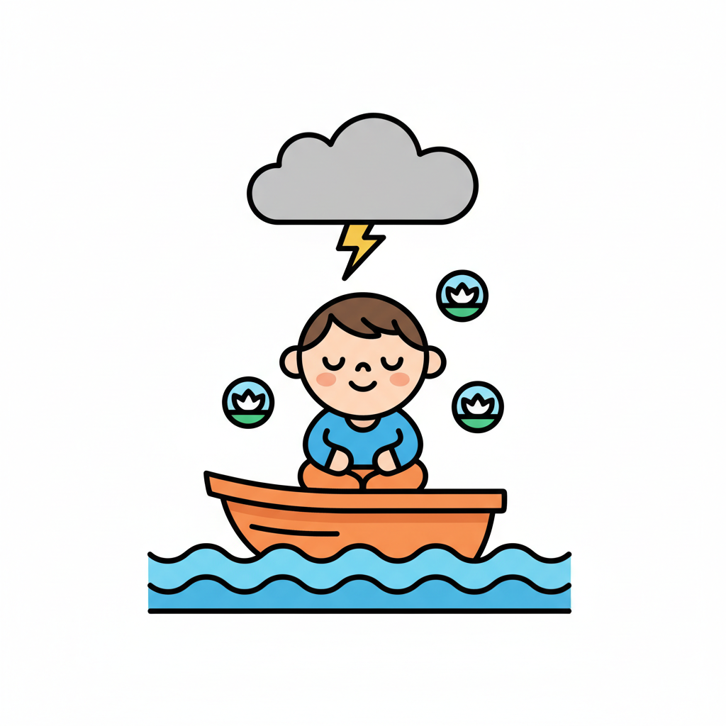 Cartoonfigur meditiert ruhig im Boot unter Gewitterwolke, umgeben von Lotusblumen.