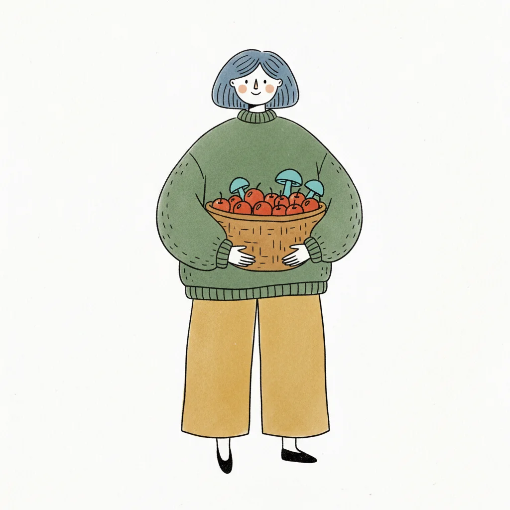 Handgezeichnete Kinderbuchillustration im modernen skandinavisch-nordischen Stil. Minimalistische, freundliche Figur mit einfachen Formen und leicht unregelmäßigen, handgezeichneten Linien. Ruhige, gedeckte Farbpalette, viel freie Fläche, reduzierte Details, sanfte Papier- oder Aquarellstruktur. Warme, ruhige, leicht humorvolle Stimmung, flächige Komposition ohne starke Perspektive, moderner nordischer Illustrationsstil, charmant und zeitlos.
