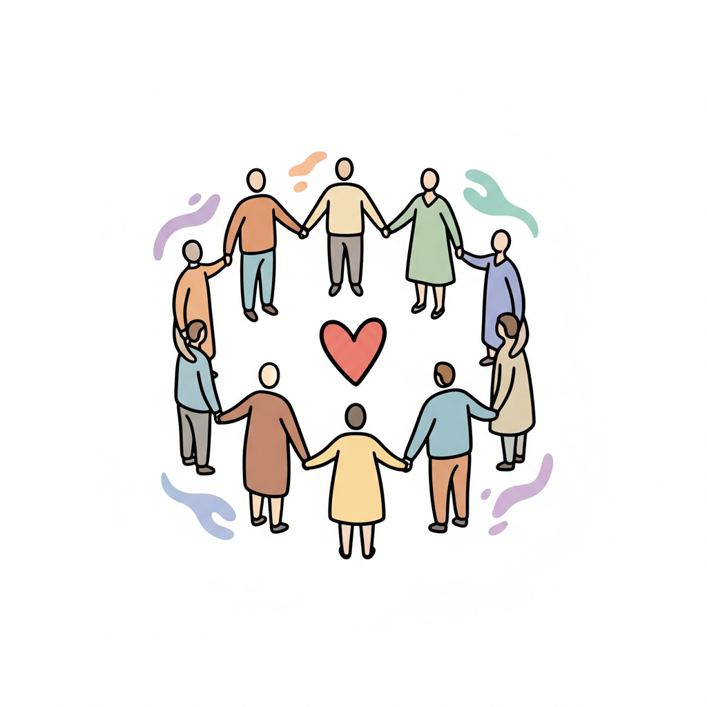 Menschen bilden einen Kreis, halten Hände um ein Herz, symbolisieren Gemeinschaft und Liebe.
