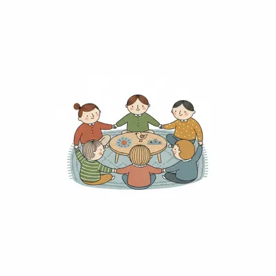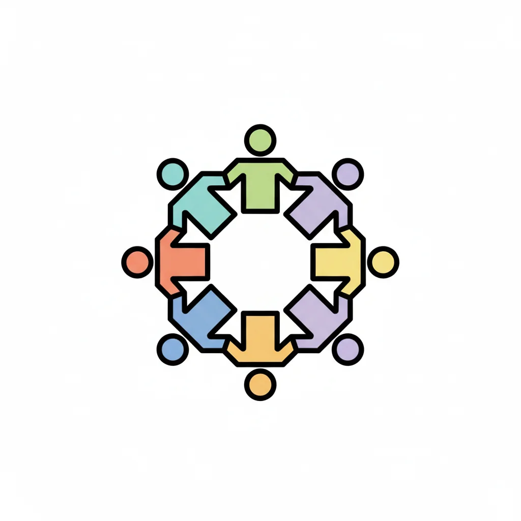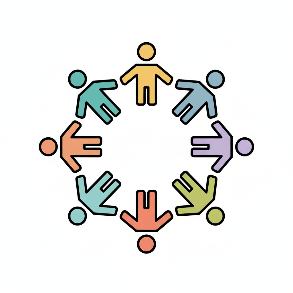 Bunte, stilisierte Figuren bilden einen Kreis, halten Hände und symbolisieren Gemeinschaft.