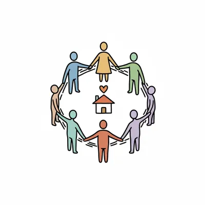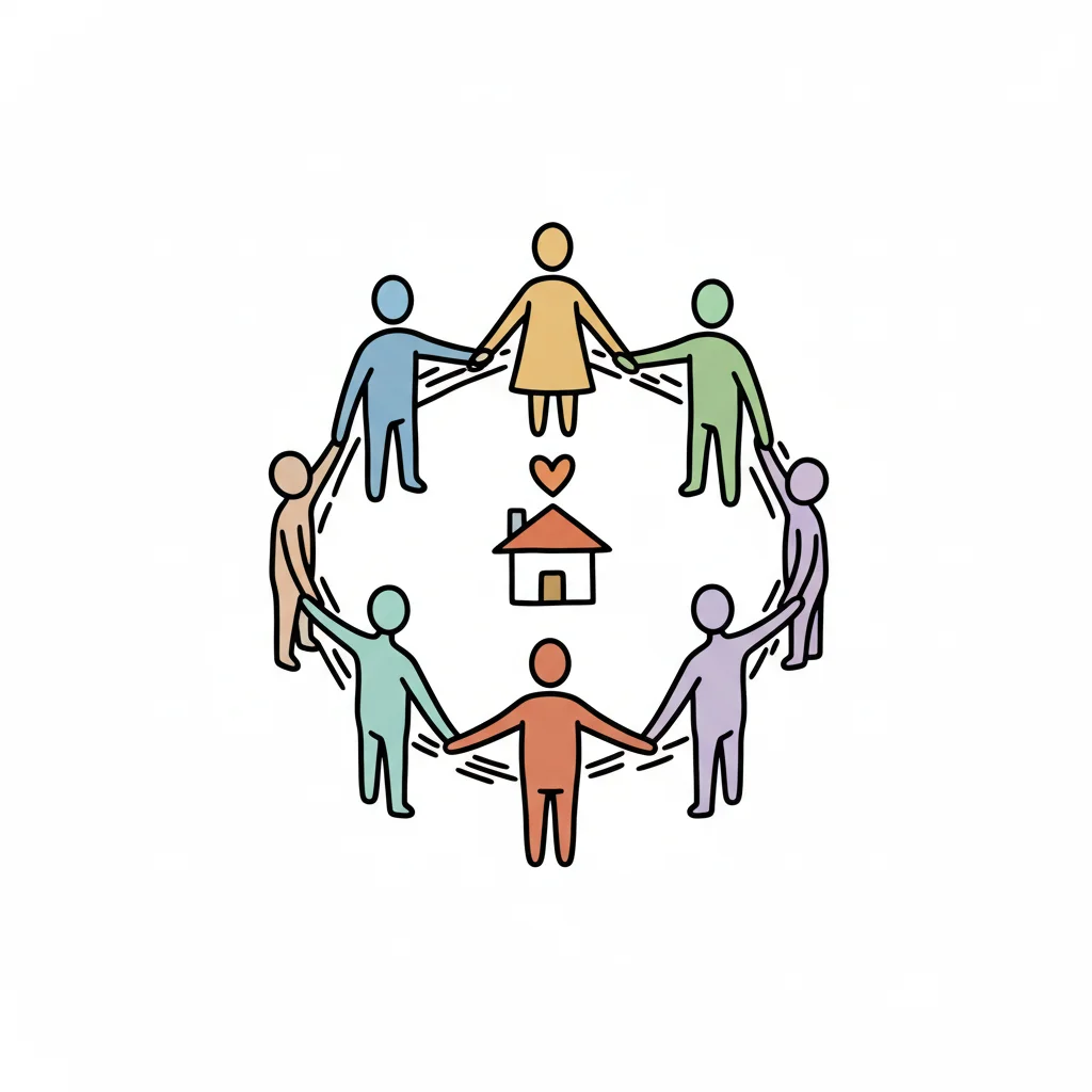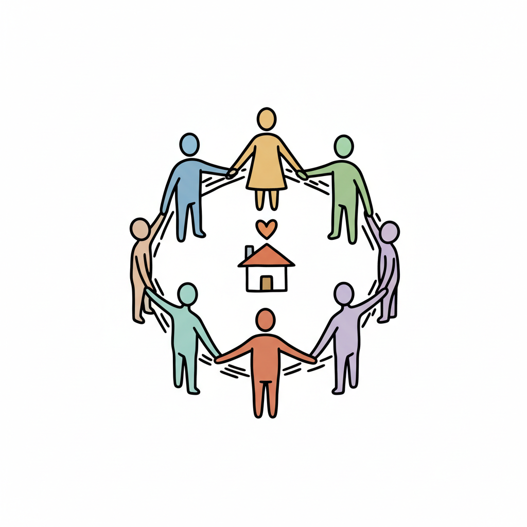 Eine Gruppe bunter Figuren hält Hände im Kreis um ein Haus mit Herz, symbolisiert Gemeinschaft und Zuhause.