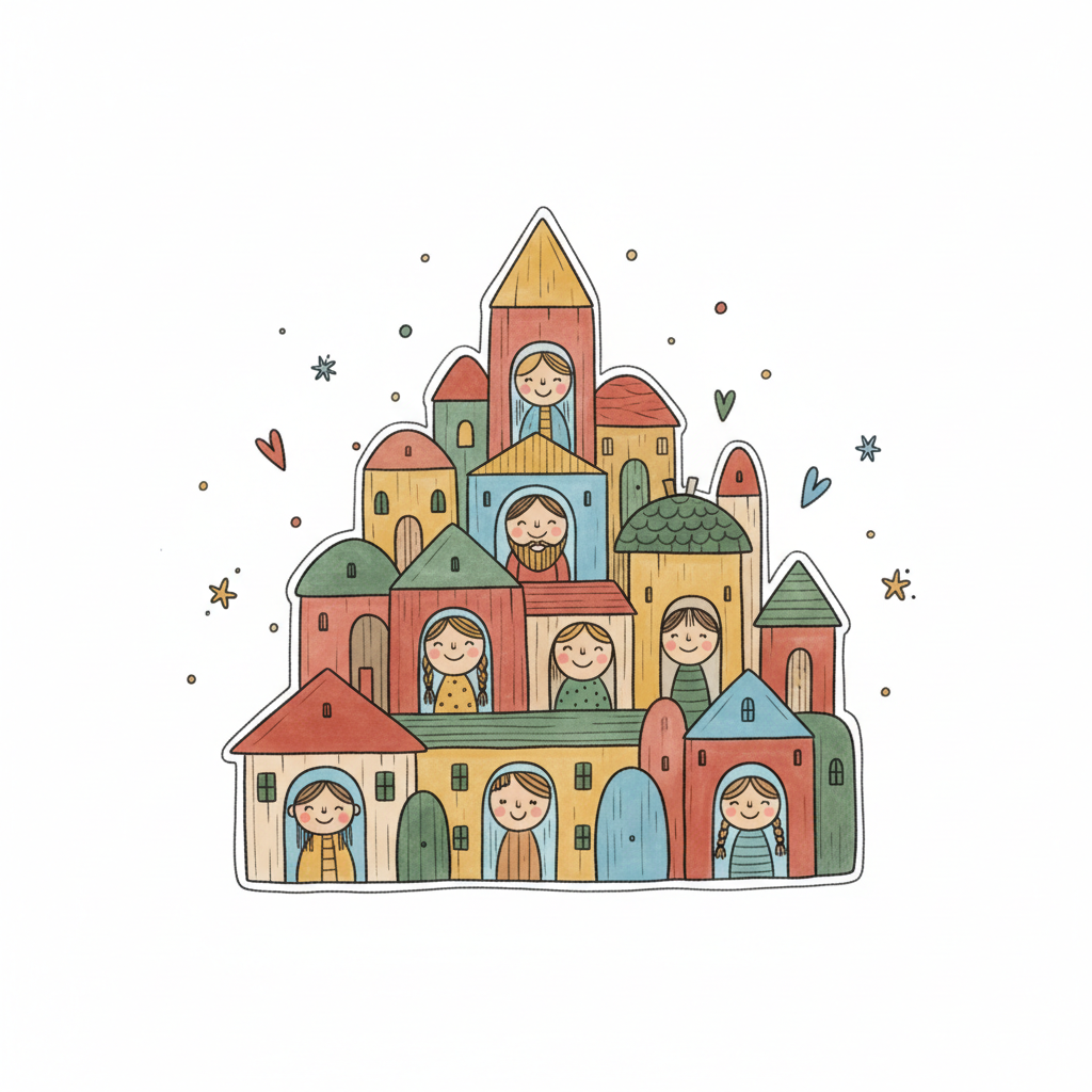 Buntes, verspieltes Dorf mit lächelnden Gesichtern in den Fenstern, umgeben von Sternen und Herzen.