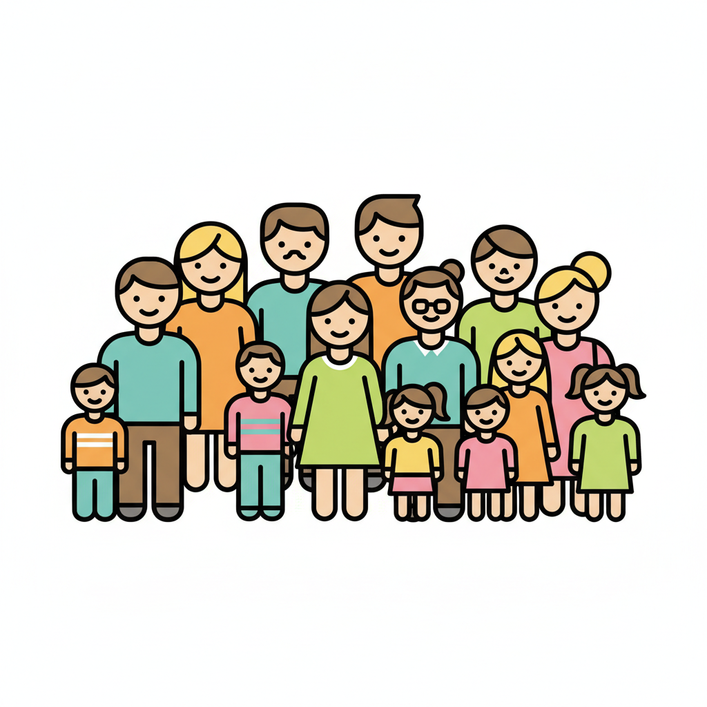 Bunte Illustration einer großen Familie oder Gemeinschaft mit Erwachsenen und Kindern in flachem Design.