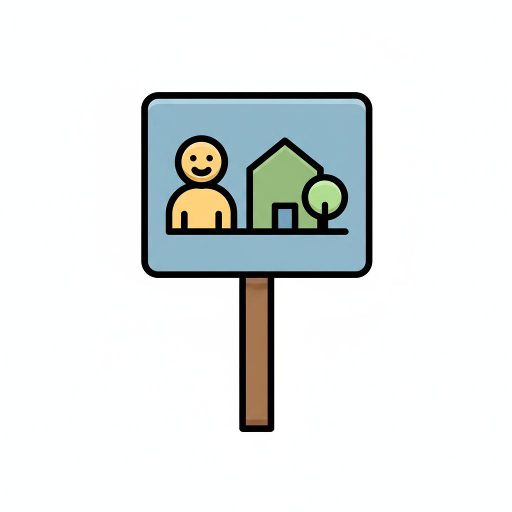 Ein Schild mit einem lächelnden Menschen, Haus und Baum, symbolisiert Zuhause oder Gemeinschaft.