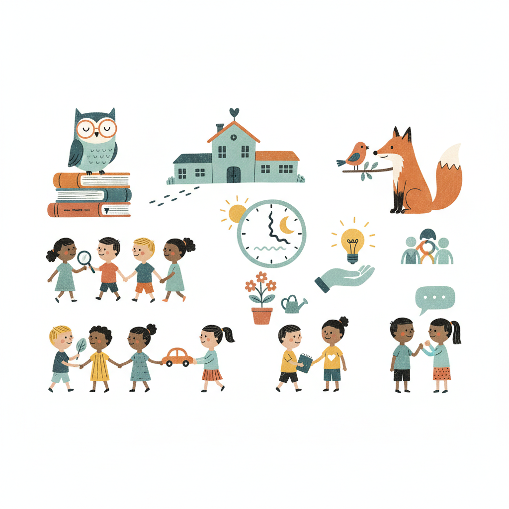 Illustration von Kindern beim Spielen und Lernen, umgeben von Symbolen für Bildung, Natur und Gemeinschaft.