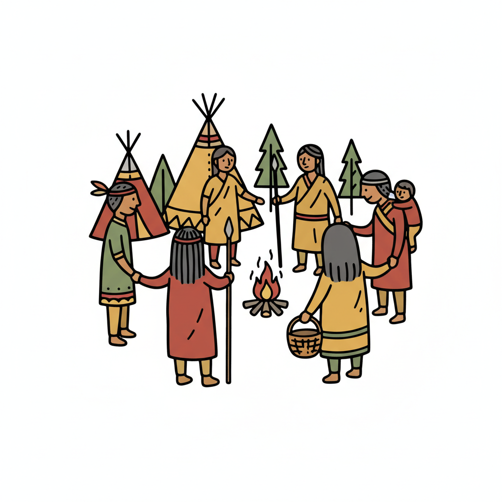 Indigene Gemeinschaft versammelt sich um ein Lagerfeuer, umgeben von Tipis und Bäumen.