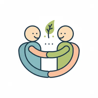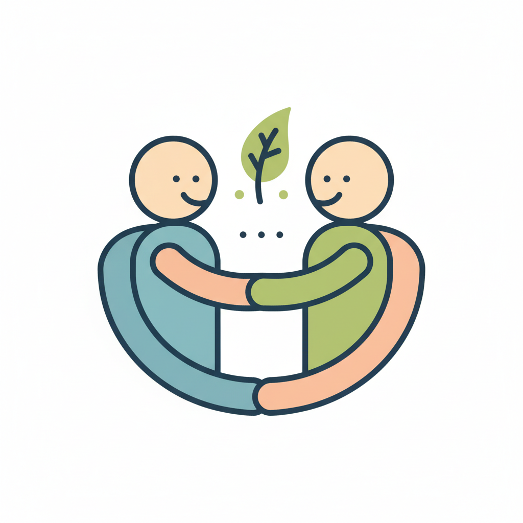 Zwei lächelnde Figuren umarmen sich, eine Pflanze wächst zwischen ihnen. Symbol für Gemeinschaft.