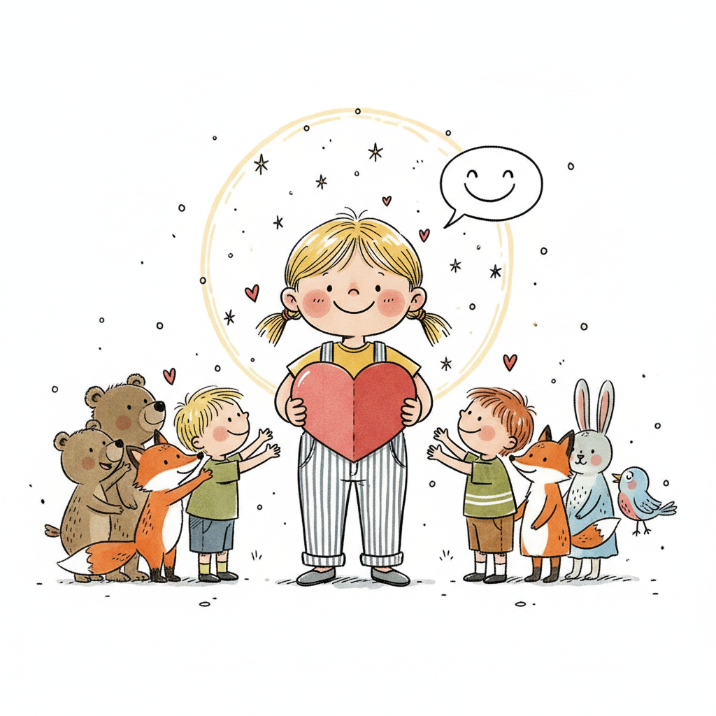 Fröhliches Mädchen mit Herz, umringt von Freunden und Tieren, symbolisiert Liebe und Gemeinschaft.