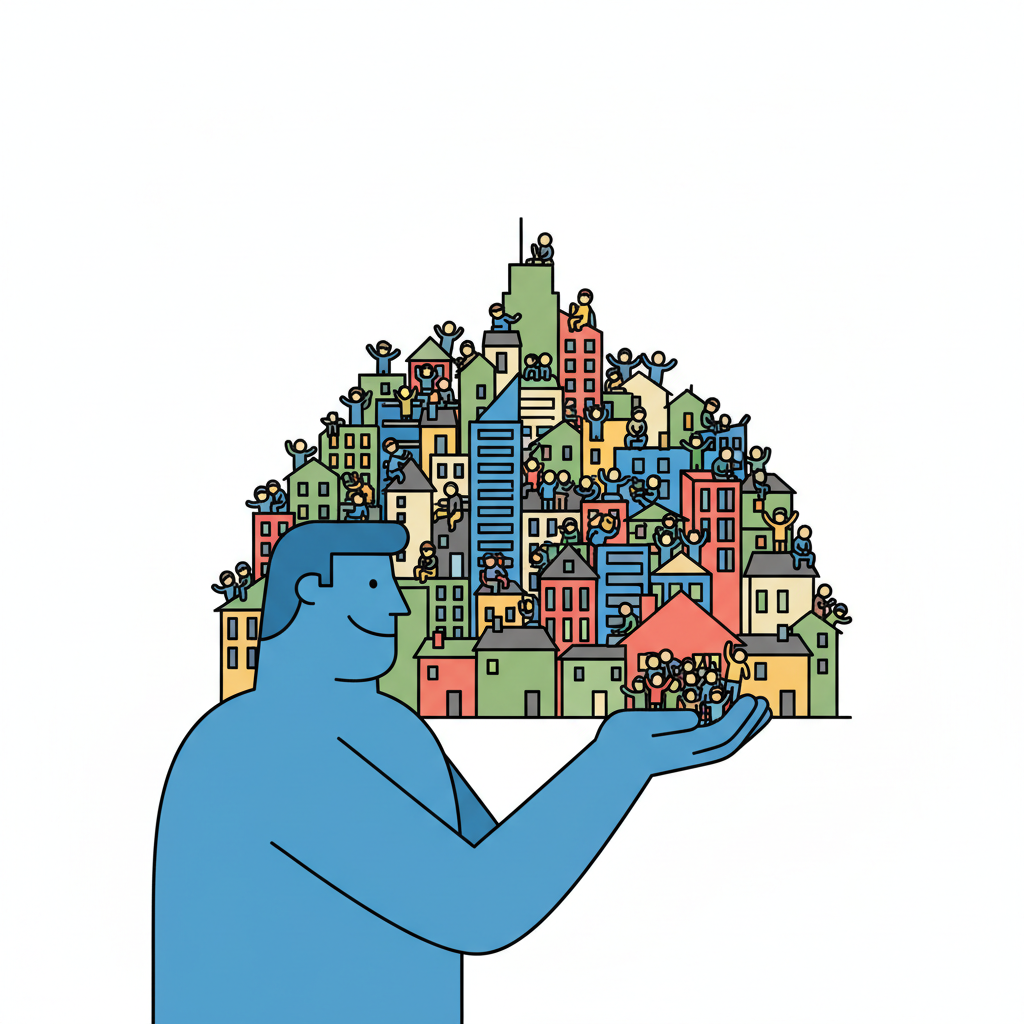 Blauer Mann hält eine bunte Stadt voller Menschen in seinen Händen.