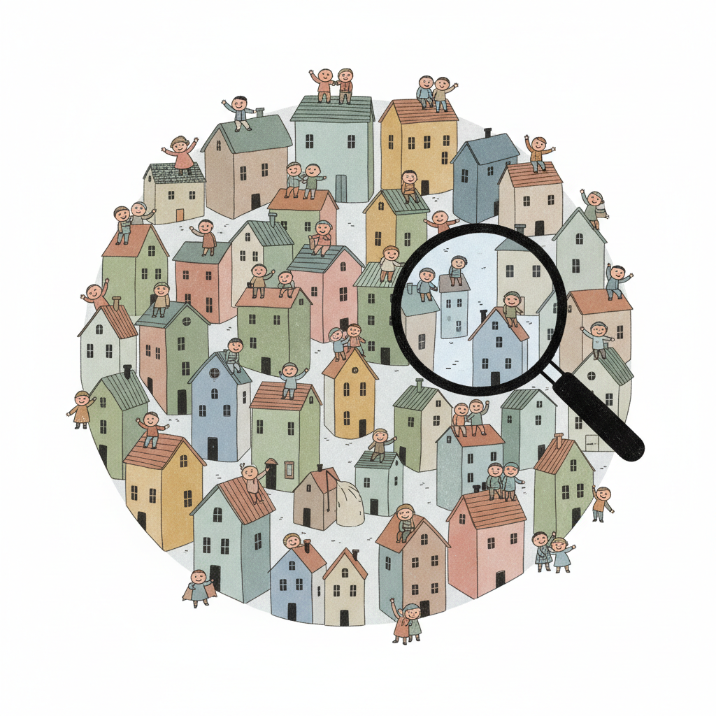 Viele bunte Häuser mit fröhlichen Menschen auf Dächern, ein Bereich wird von einer Lupe hervorgehoben.