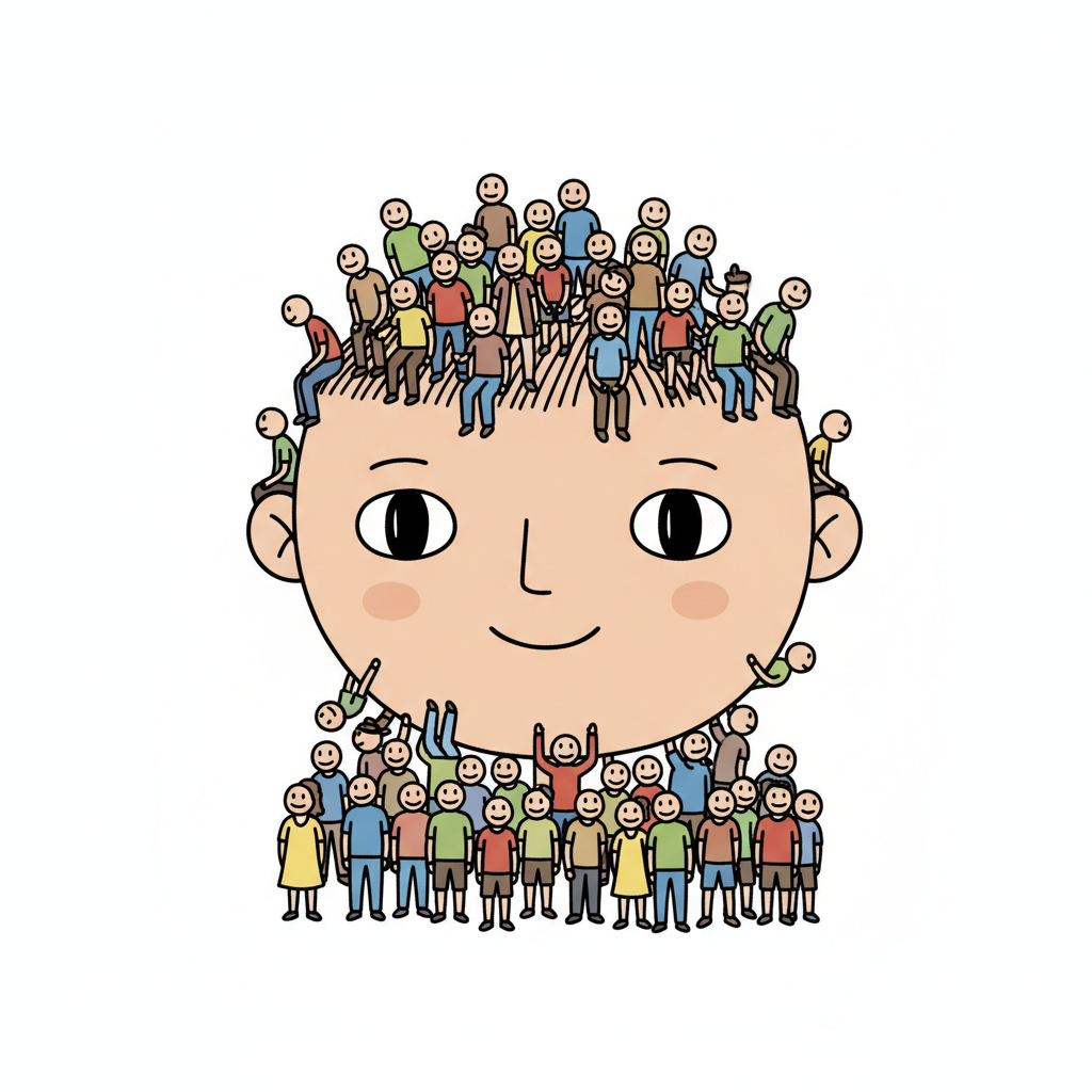 Ein großer Cartoon-Kopf, bedeckt und umgeben von vielen kleinen Menschen, die eine Gemeinschaft bilden.