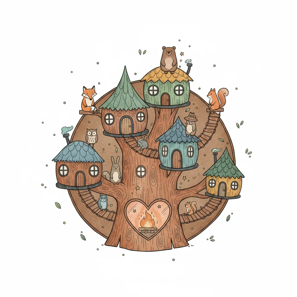Niedliche Illustration eines Baumhauses mit vielen Tierbewohnern und kleinen Häusern, Herz-Kamin.