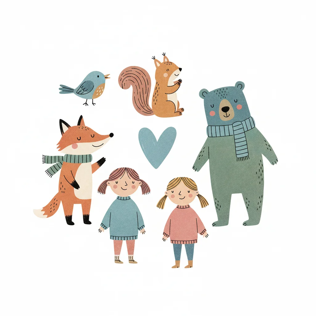 Niedliche Illustration von Waldtieren (Fuchs, Bär, Eichhörnchen, Vogel) und zwei Mädchen mit Herz.