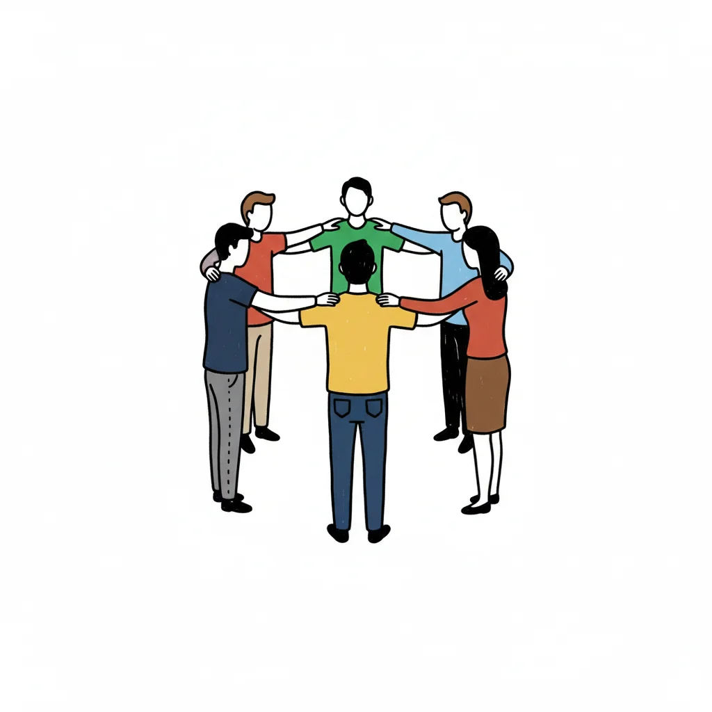 Sechs Personen stehen im Kreis und halten sich an den Schultern, symbolisierend Zusammenhalt.