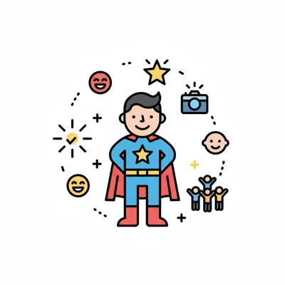 Ein Superheld umgeben von Symbolen für Erfolg, Glück, Anerkennung und Gemeinschaft.
