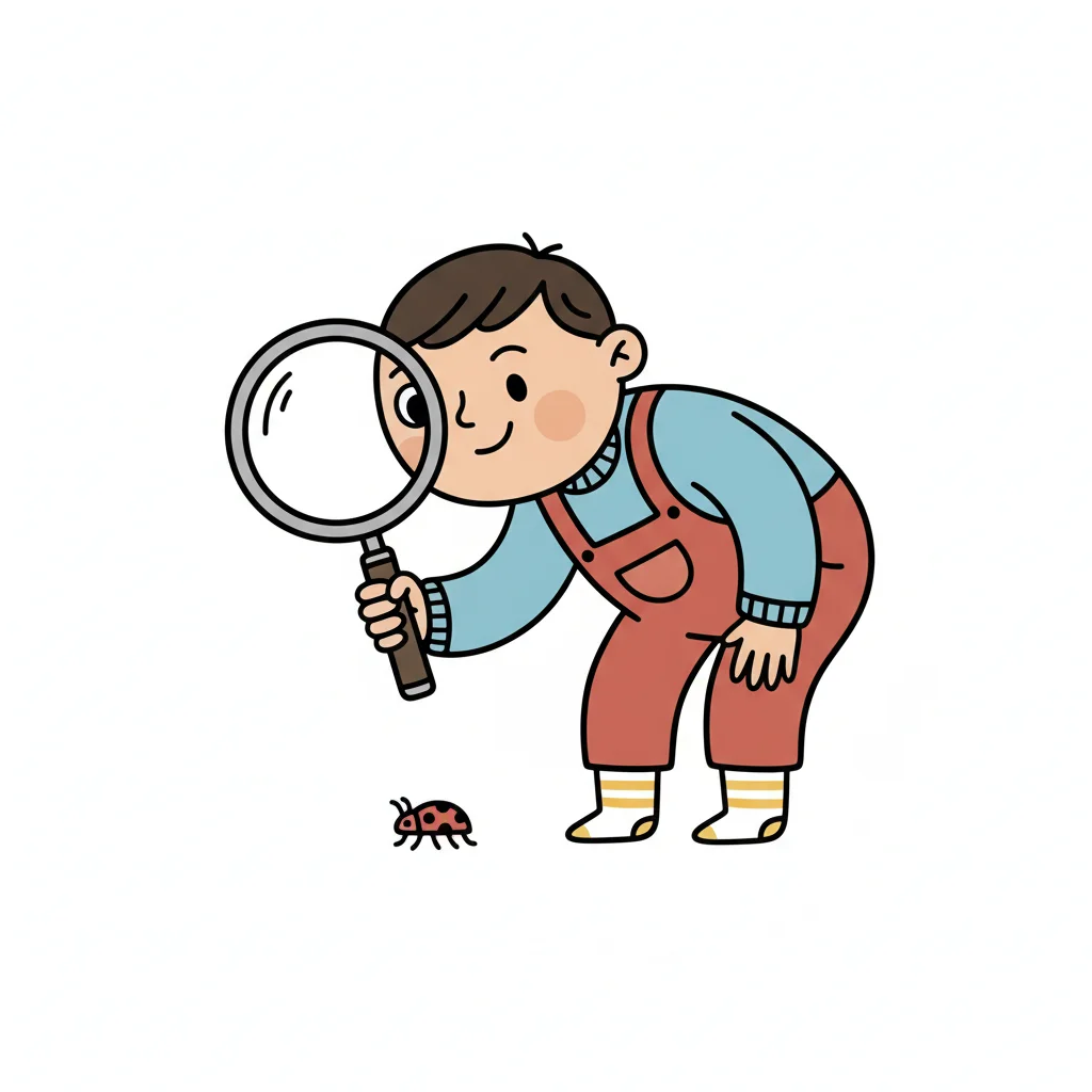 Ein Junge beobachtet mit einer Lupe einen Marienkäfer.