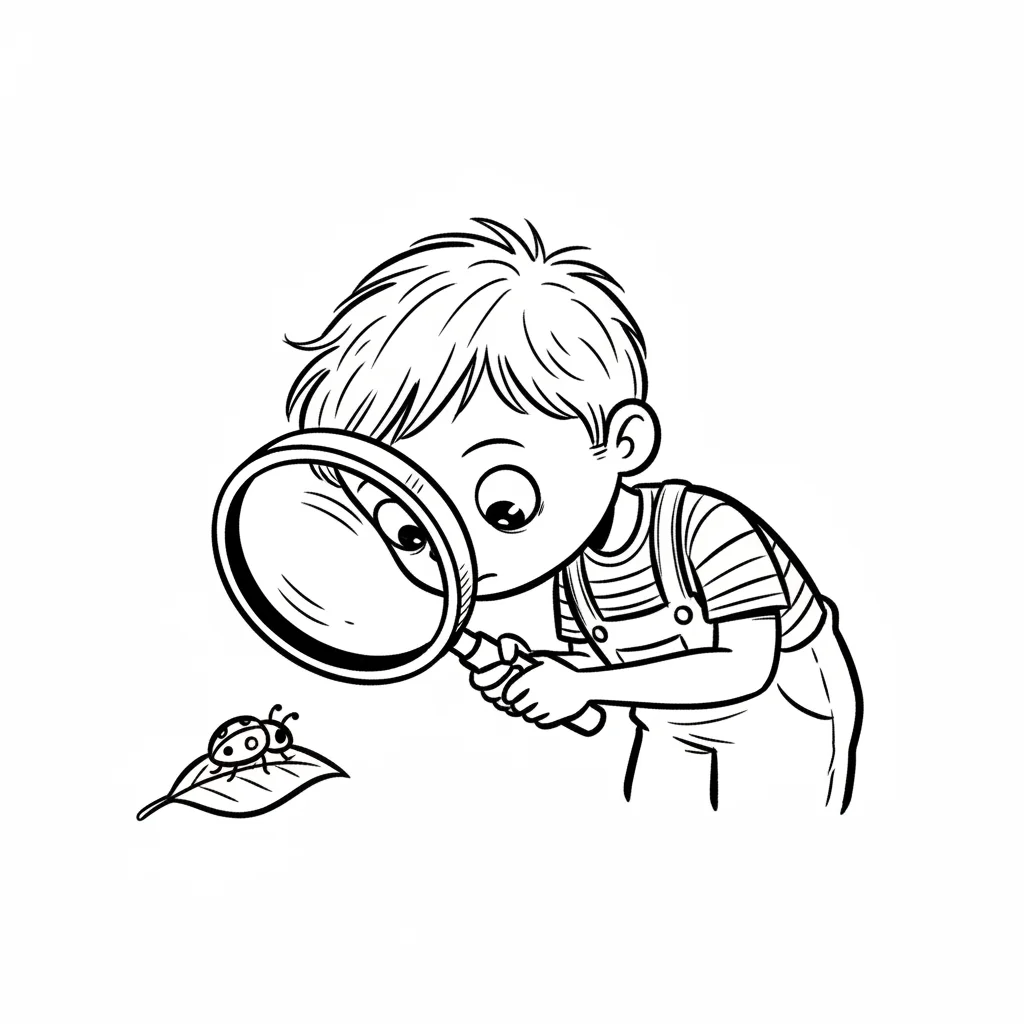Ein Junge beobachtet neugierig einen Käfer mit einer Lupe.