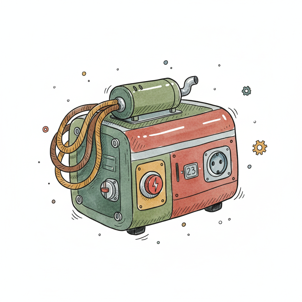 Aquarell-Illustration eines Generators mit Auspuff, Kabeln und Steckdose in Rot und Grün.