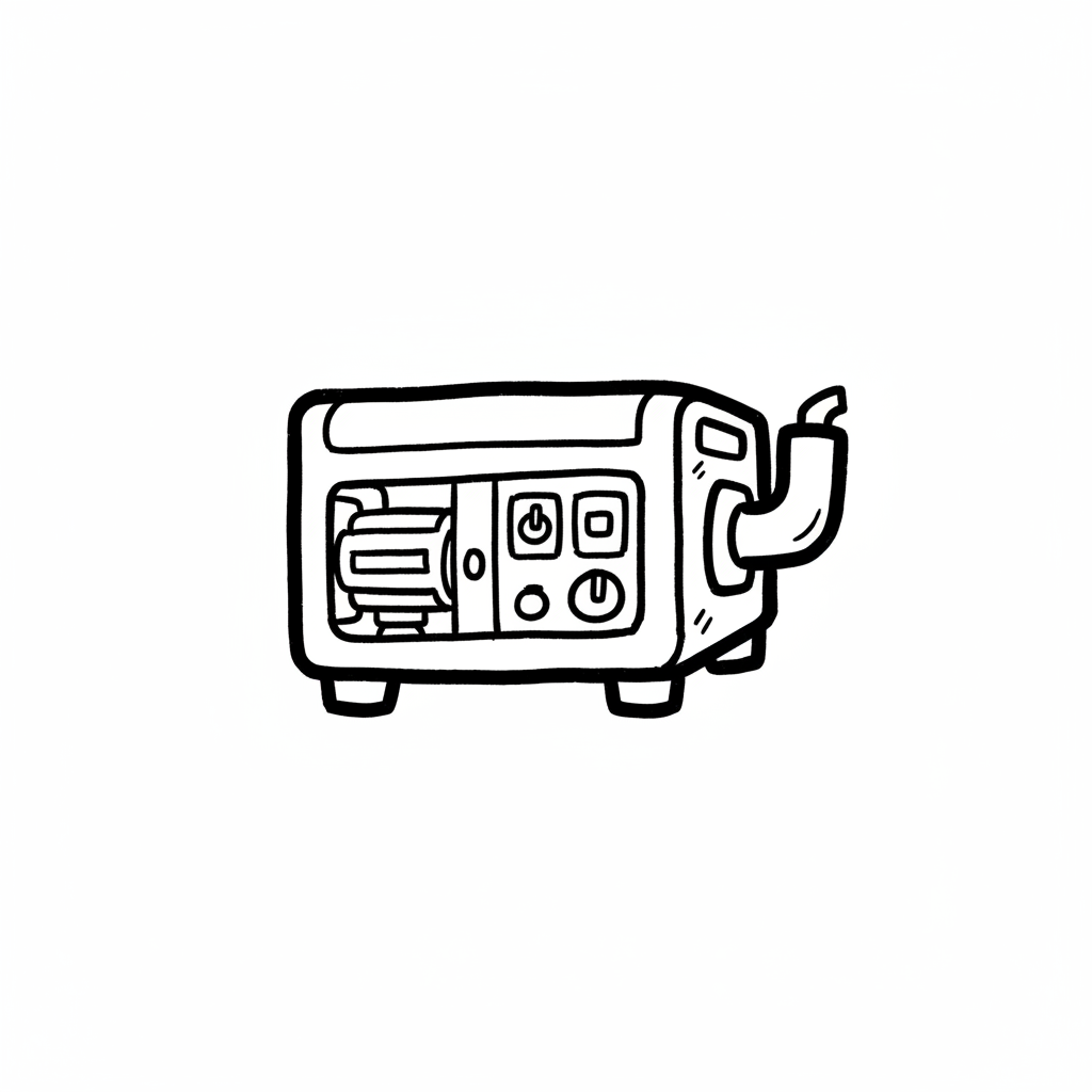 Strichzeichnung eines tragbaren Stromgenerators mit Bedienfeld und Auspuff.