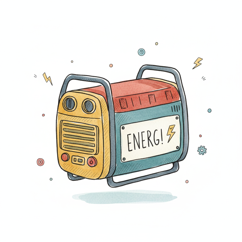 Aquarell-Illustration eines bunten Stromgenerators mit "ENERG!"-Schild und Blitzen.