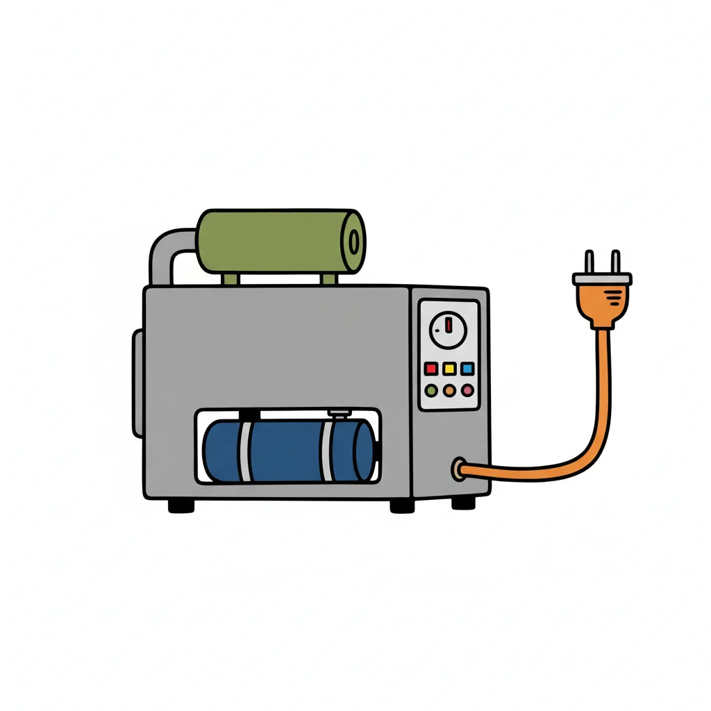 Cartoon einer grauen Maschine mit Tanks, Bedienfeld und Stromkabel auf weißem Hintergrund.