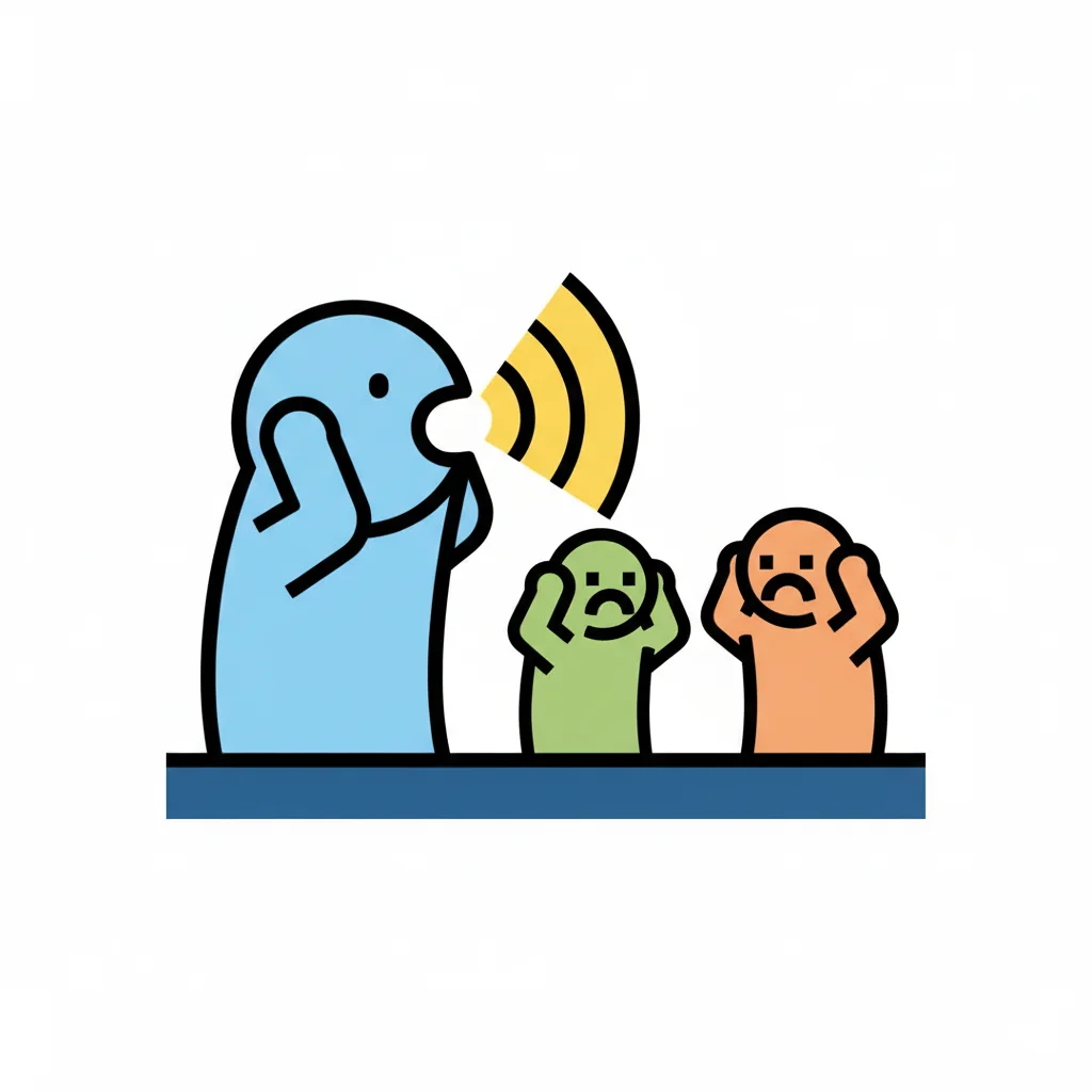 Eine große Figur spricht laut, während zwei kleinere sich die Ohren zuhalten, genervt vom Lärm.