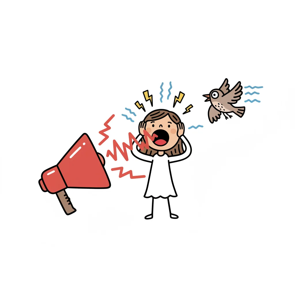 Cartoon einer Person, die sich die Ohren zuhält, genervt von Lärm von Megafon und Vogel.