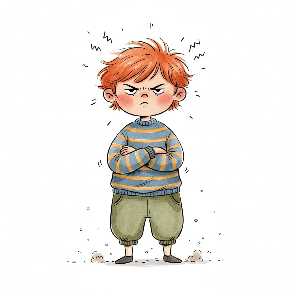 Wütender kleiner Junge mit roten Haaren und verschränkten Armen, genervt schauend.
