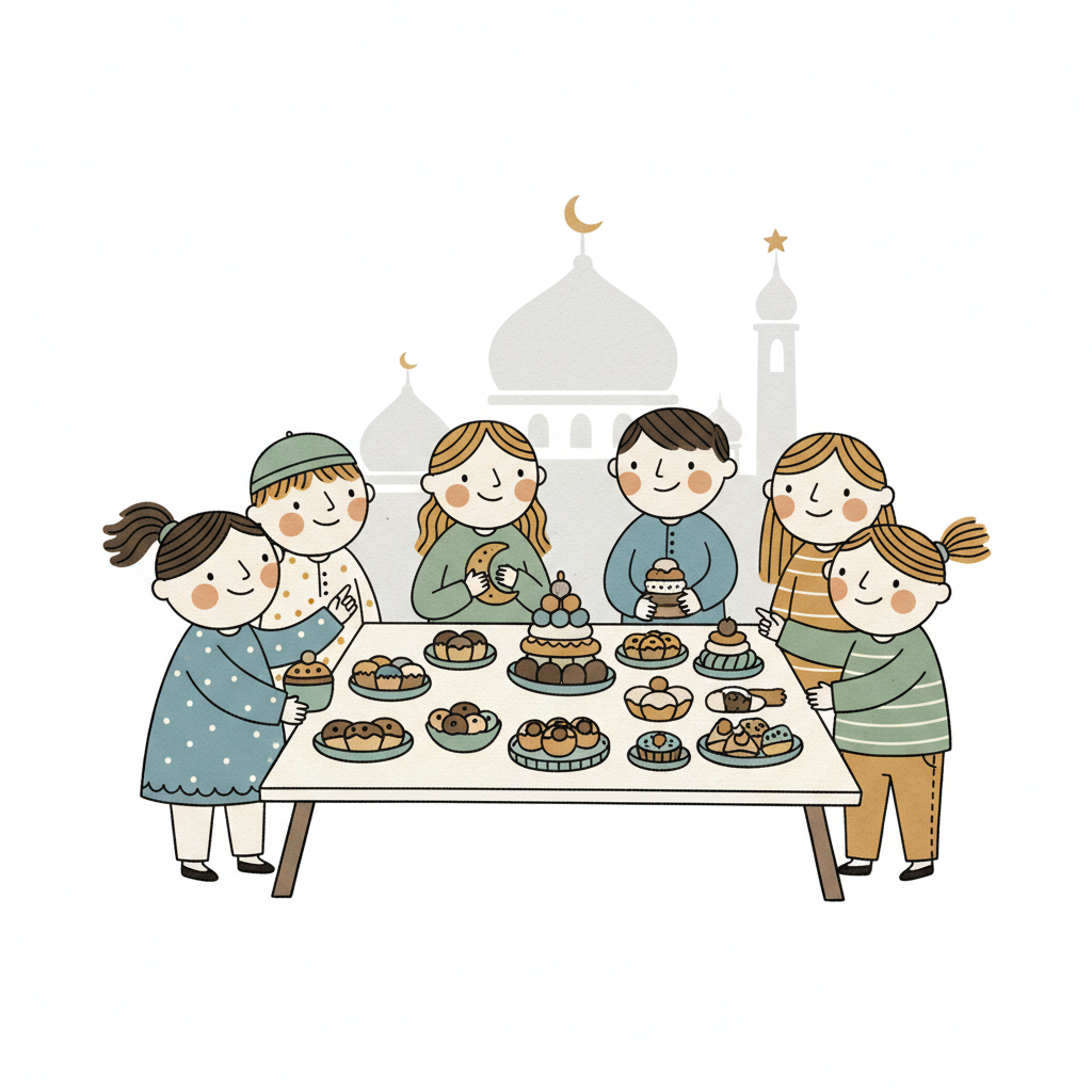 Fröhliche Kinder genießen Süßigkeiten vor einer Moschee, wahrscheinlich zum Eid-Fest.