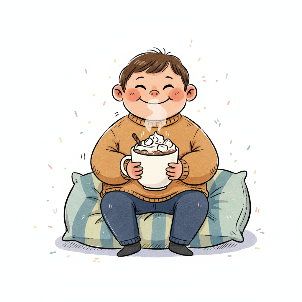 Glückliches Cartoon-Kind sitzt auf Kissen, hält dampfenden Kakao mit Sahne und Marshmallows.