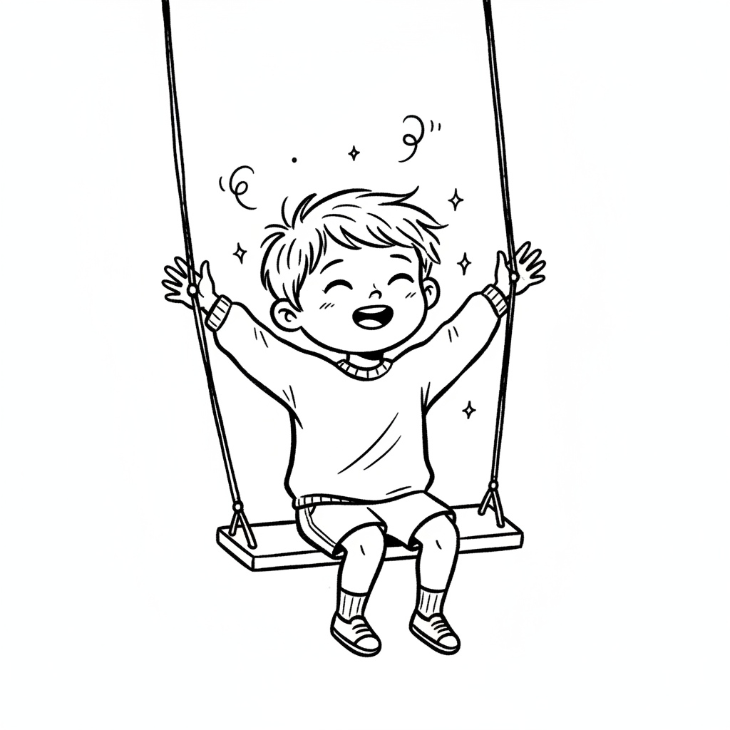 Glücklicher Junge auf Schaukel, lachend mit erhobenen Armen. Schwarz-weiß-Illustration.