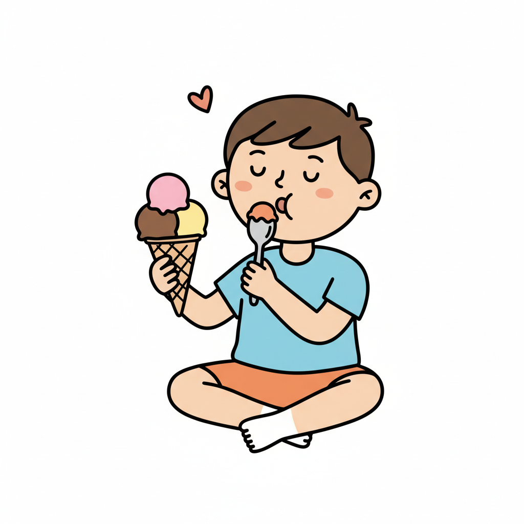 Ein glücklicher Cartoon-Junge isst genüsslich Eiscreme aus einem Hörnchen mit einem Löffel.