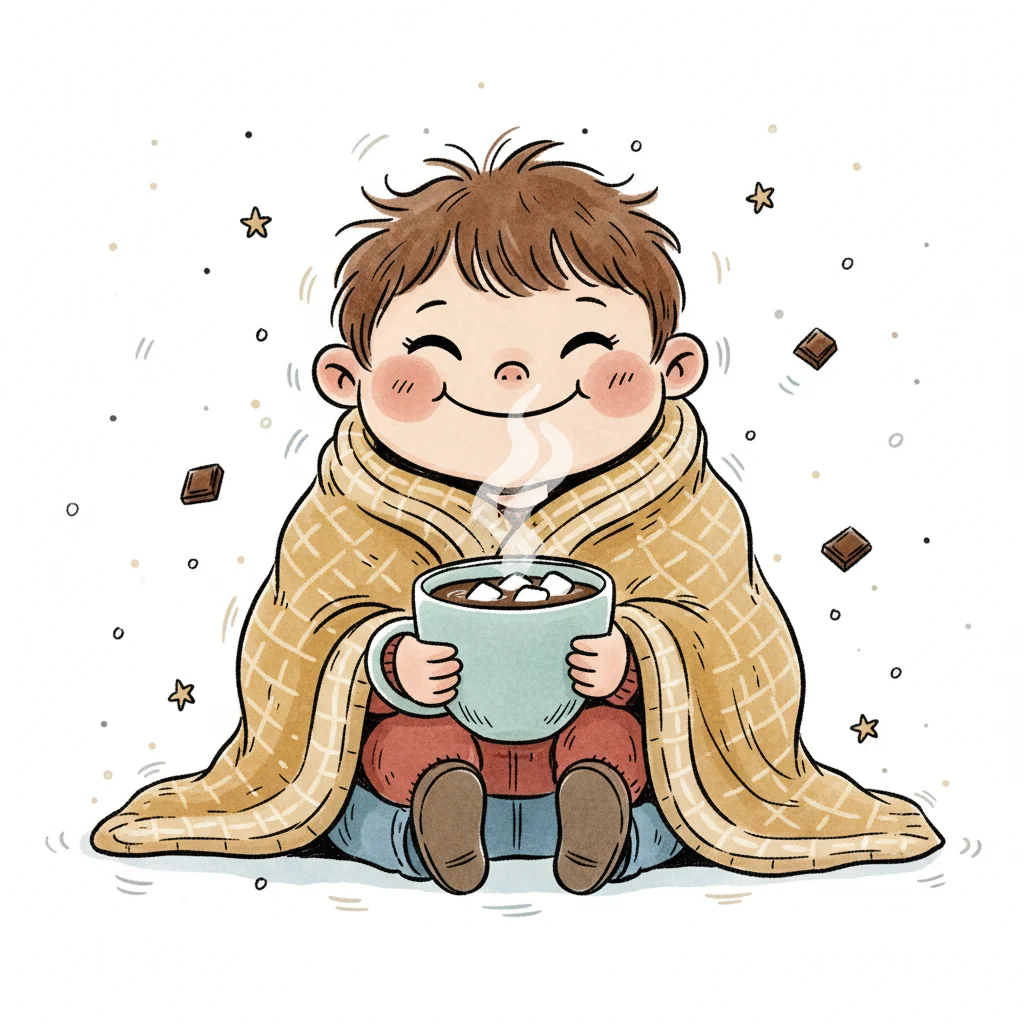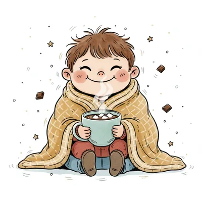 Ein glückliches Kind, eingekuschelt in eine Decke, genießt heiße Schokolade mit Marshmallows.