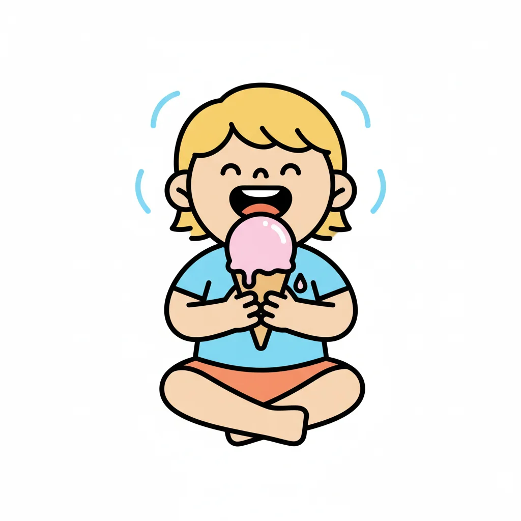 Ein glückliches Cartoon-Kind mit blonden Haaren isst genüsslich ein rosa Eis.