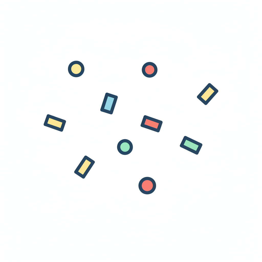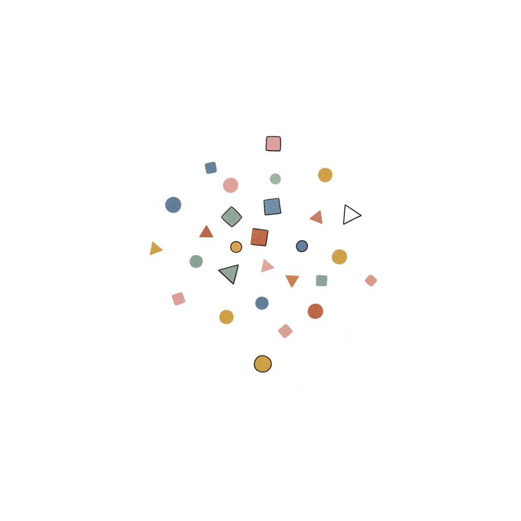 Bunte geometrische Formen in verschiedenen Farben, auf hellem Hintergrund verstreut.