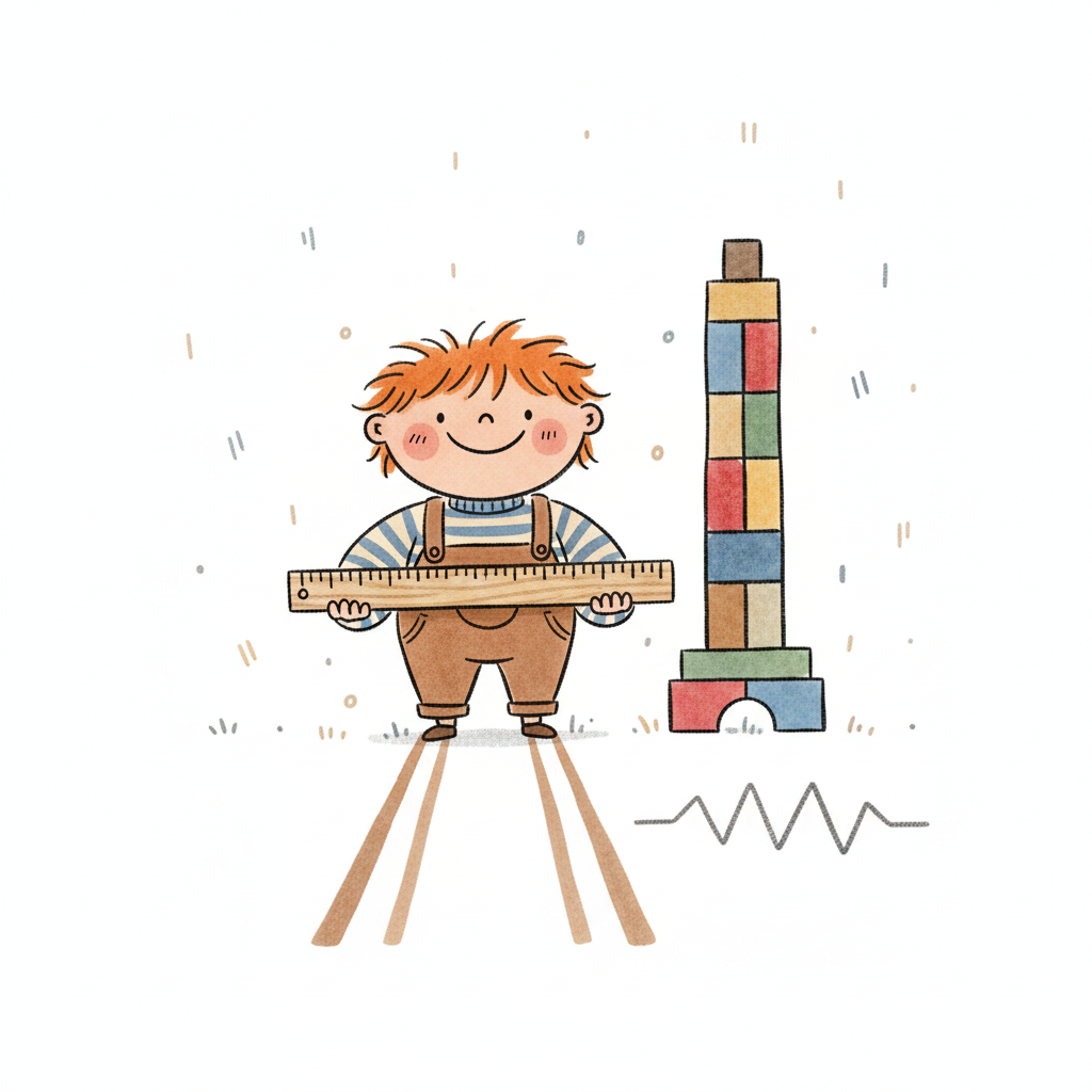Ein lächelnder Junge hält einen Stock, daneben Lineal und wellige Linien.