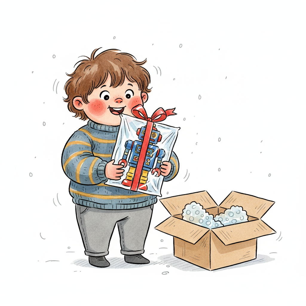 Ein glücklicher Junge hält einen neuen Roboter, den er gerade aus einem Paket ausgepackt hat.