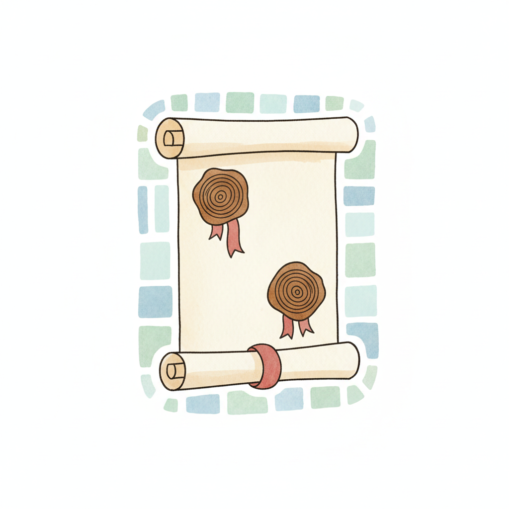 Gerollte Urkunde mit zwei Wachssiegeln und Bändern auf hellem Hintergrund mit Kachelrand.