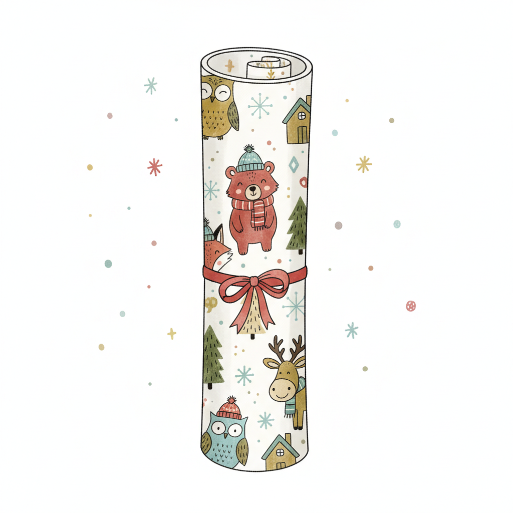 Gerolltes Geschenkpapier mit winterlichen Tiermotiven (Bär, Fuchs, Eule, Rentier) und Schneeflocken.