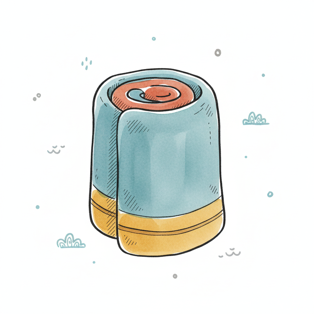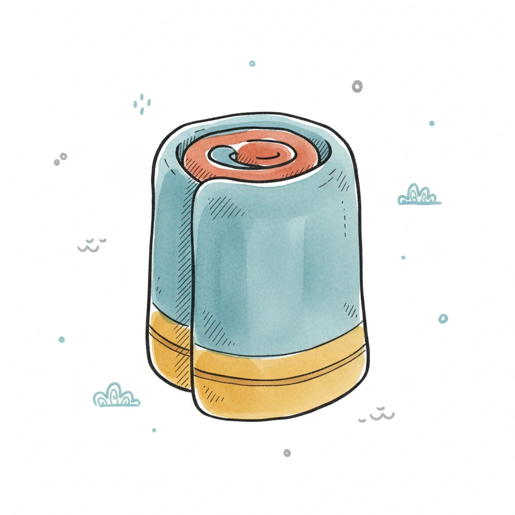 Aquarell-Illustration eines gerollten Handtuchs in Blau, Orange und Gelb auf weißem Grund.
