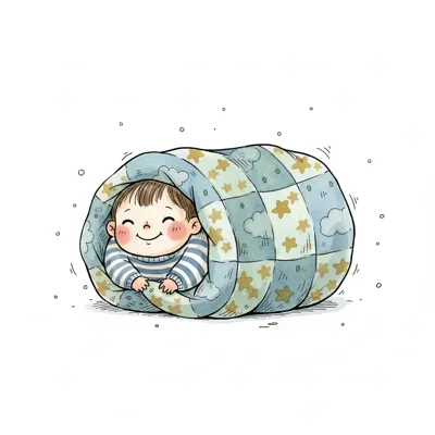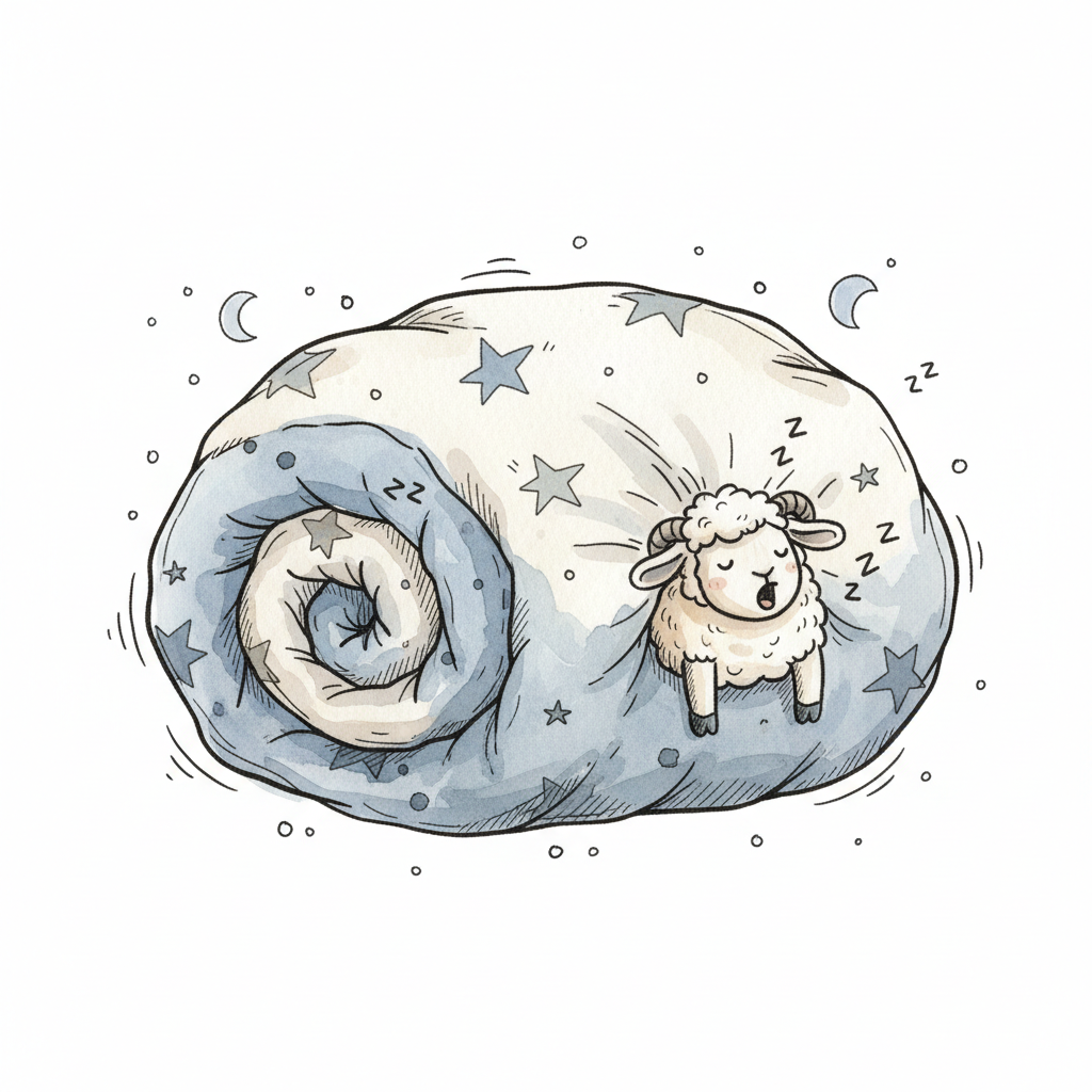 Ein süßes Schaf schläft gemütlich eingerollt in einer sternenbedeckten Decke.
