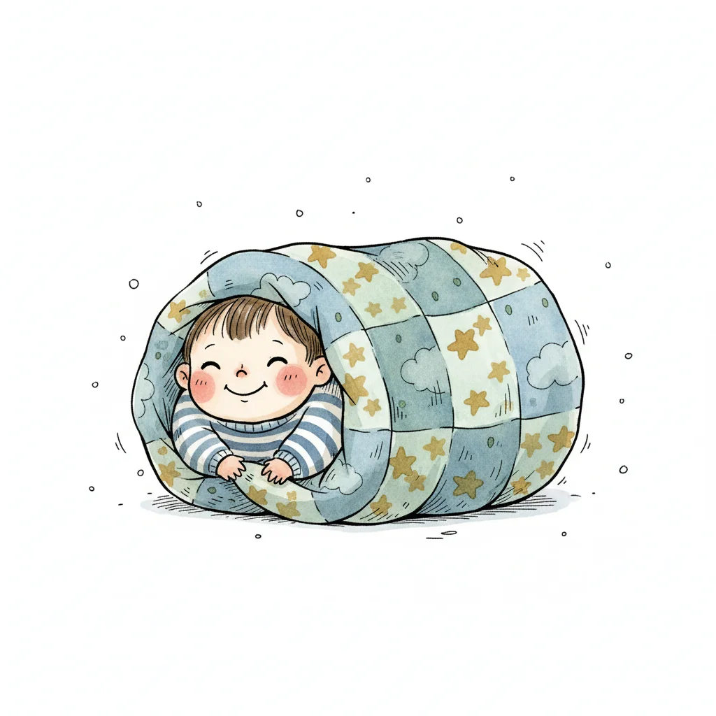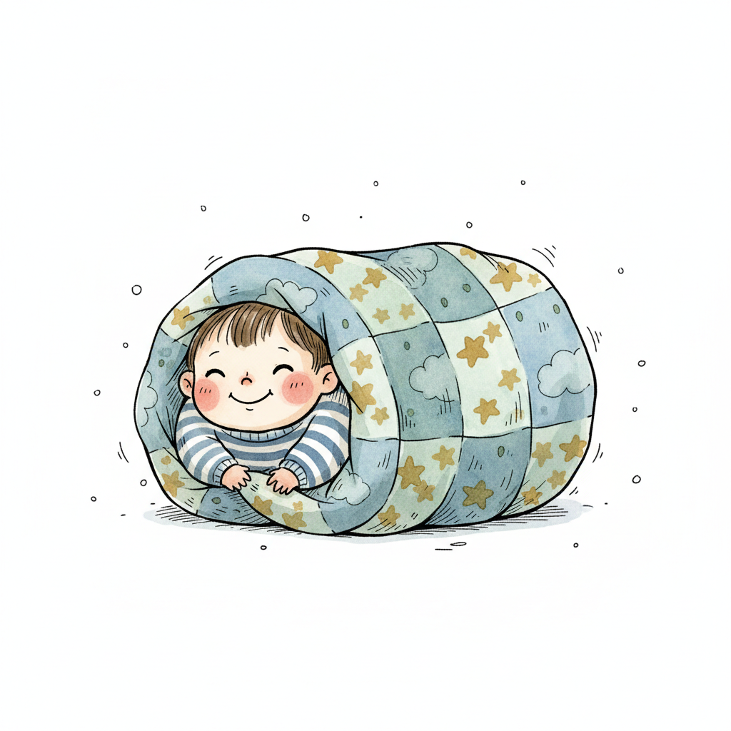 Ein süßes, lächelndes Baby kuschelt sich gemütlich in eine blaue Decke mit Sternen und Wolken.