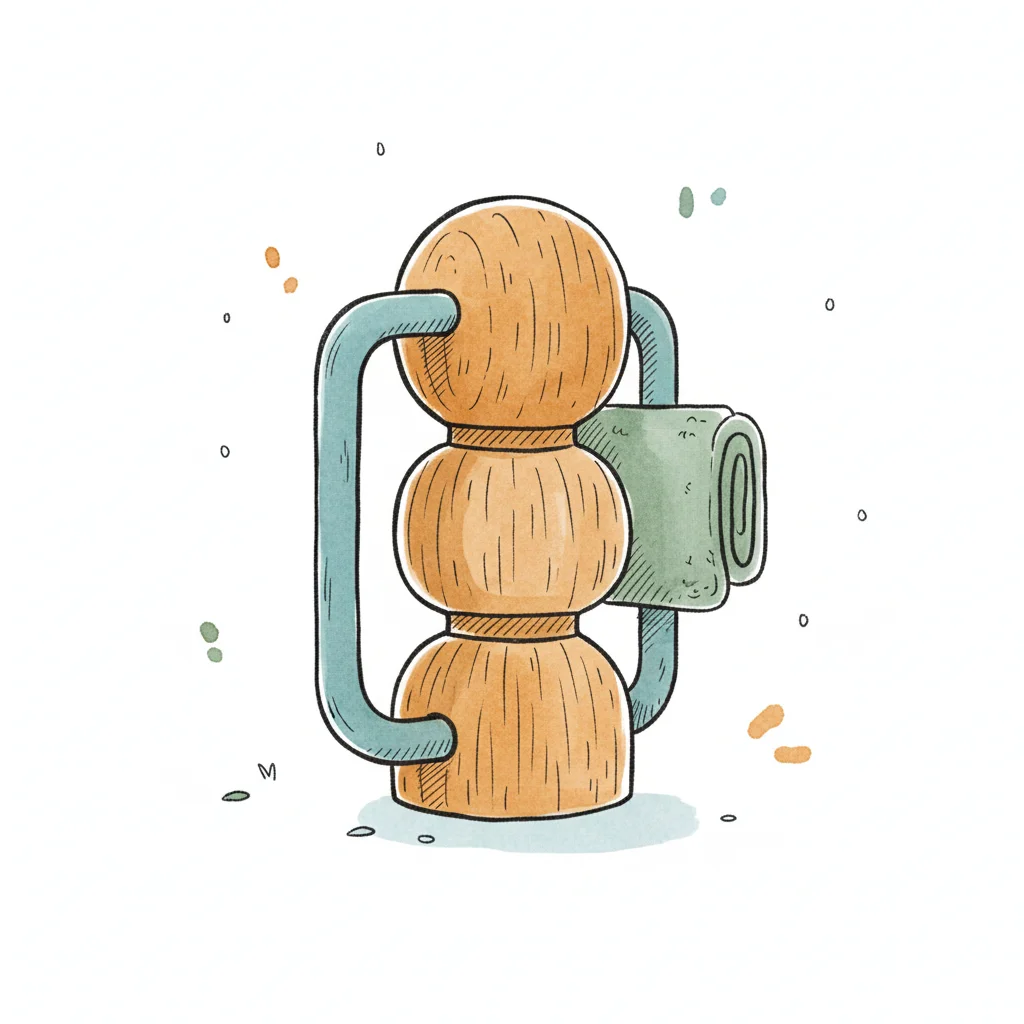 Aquarell-Illustration eines hölzernen Handtuchhalters mit blauem Bügel und gerolltem Handtuch.