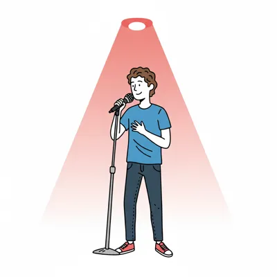 Ein junger Mann singt mit Mikrofon im Spotlight.